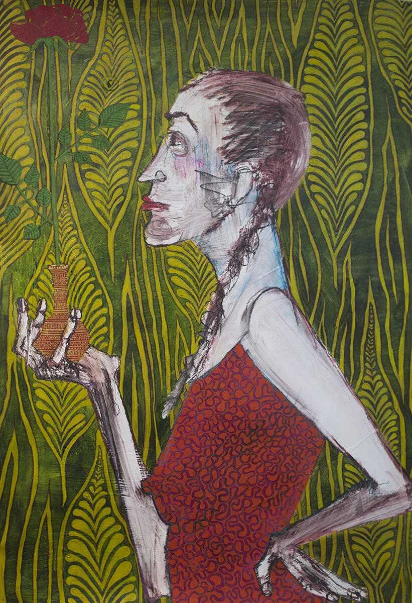 Nancy Rosen works on a variety of surfaces. She creates her images with the application of oil bars, china markers, graphite and oil paint, using live models. With her complex backgrounds she accentuates the quiet inner beauty of her figure and draws life itself into her subject.