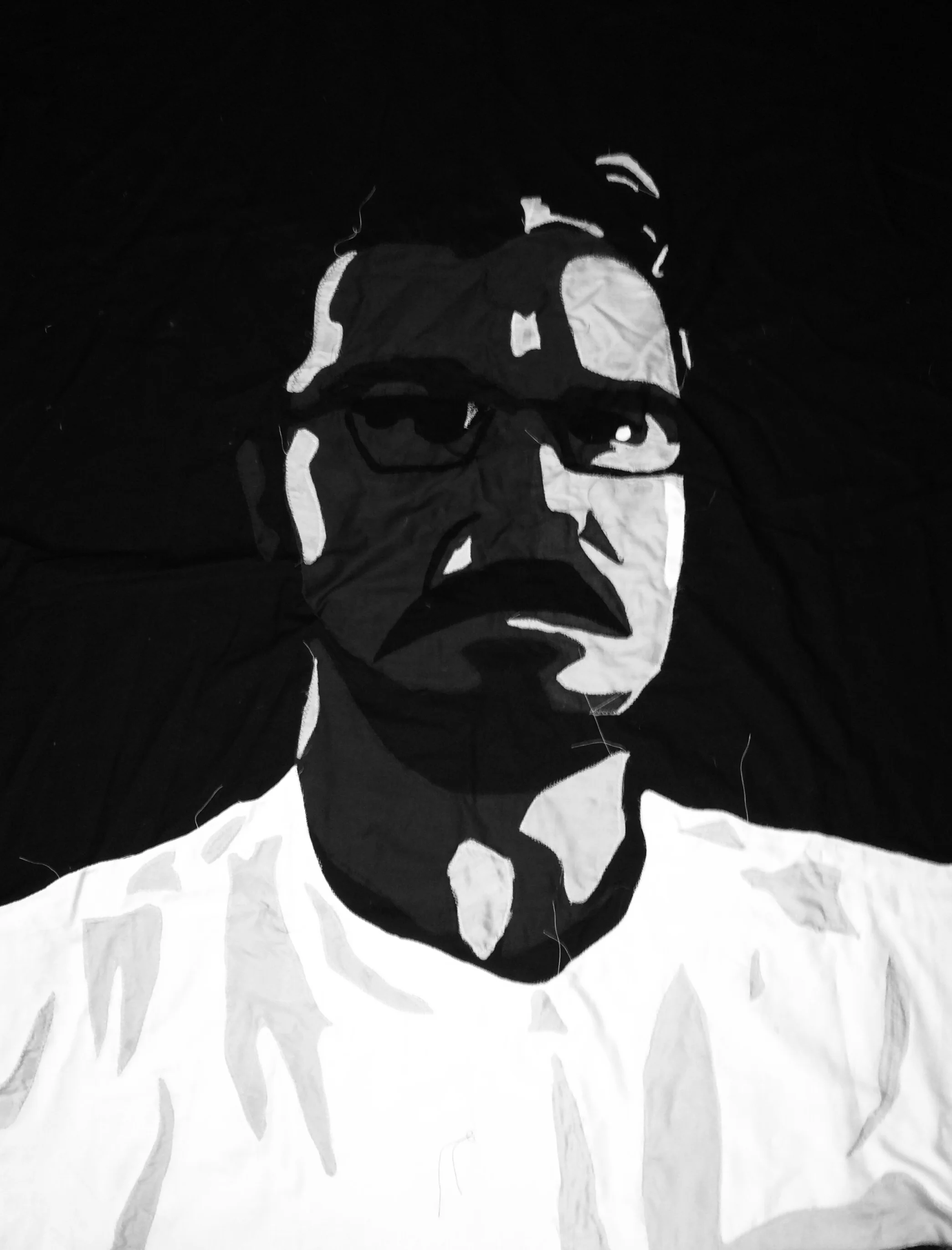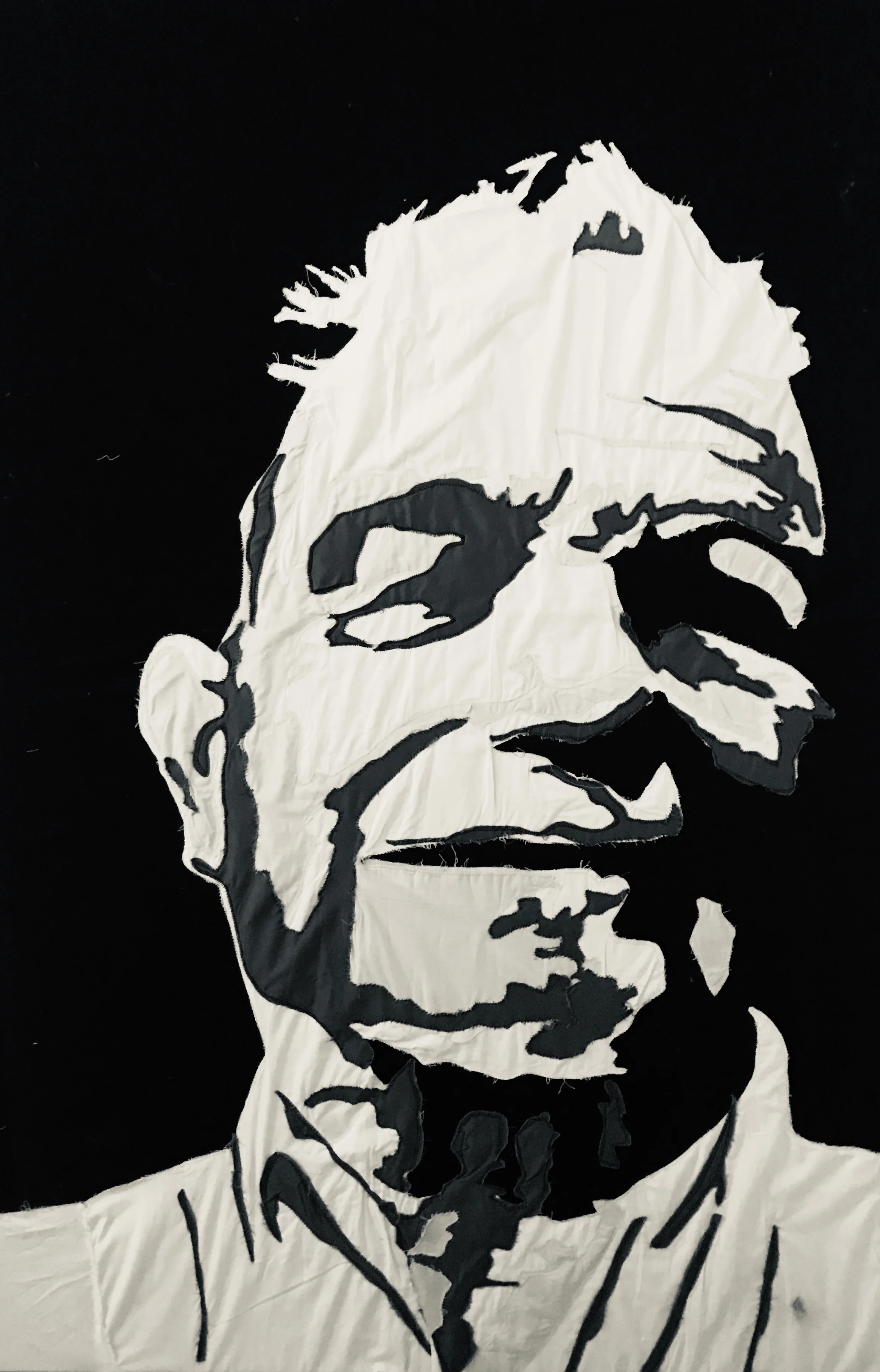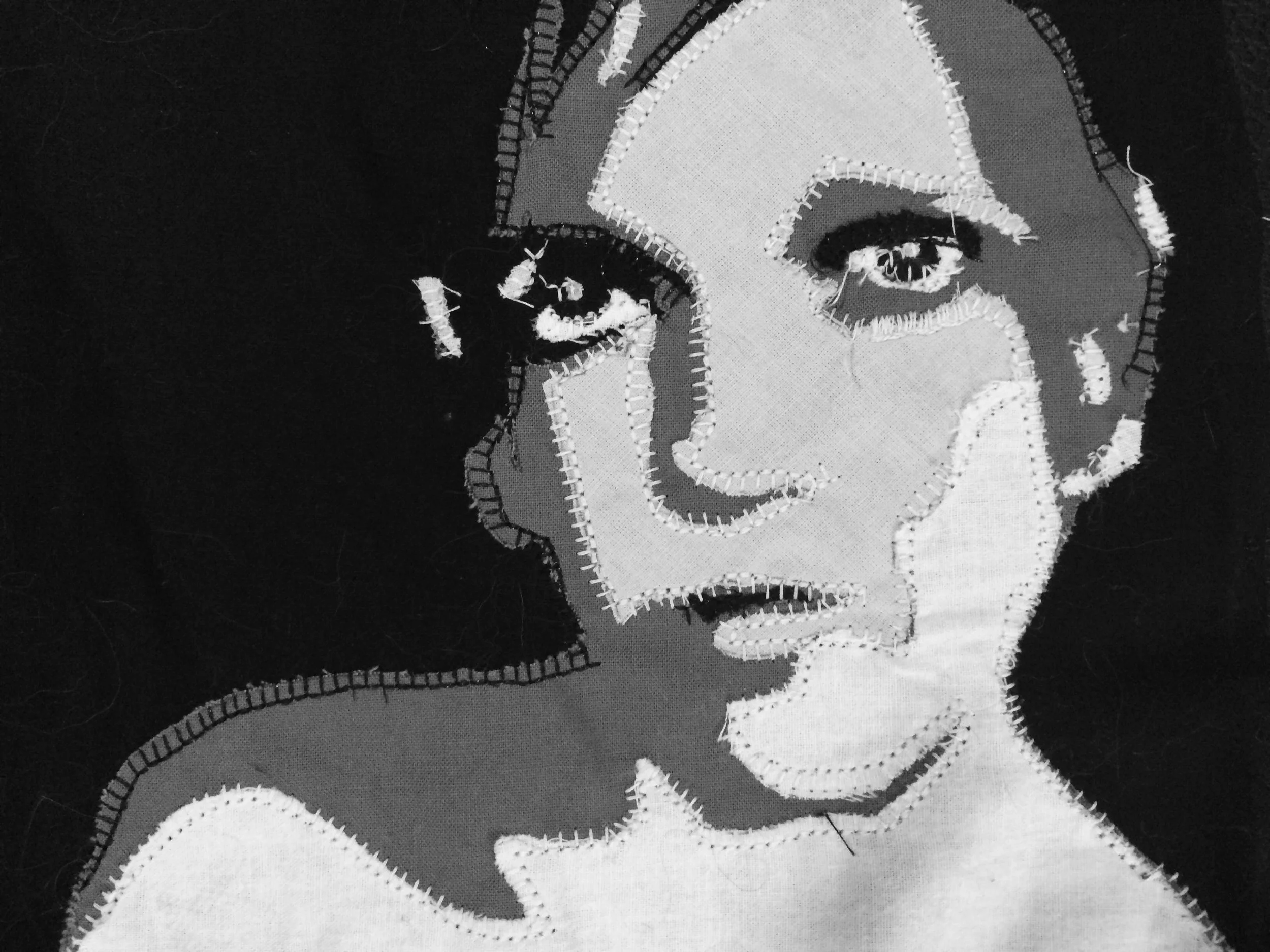 Erica Entrop's work involves a quilting process by simplifying, deconstructing, and reassembling portraits of familiar faces to recontextualize the idea of the 'selfie.' By using oddly shaped fabric scraps with varying opacities, she layers these pieces through stitching. Quilts having that historical or heirloom quality emphasize the contrast of the two notions.