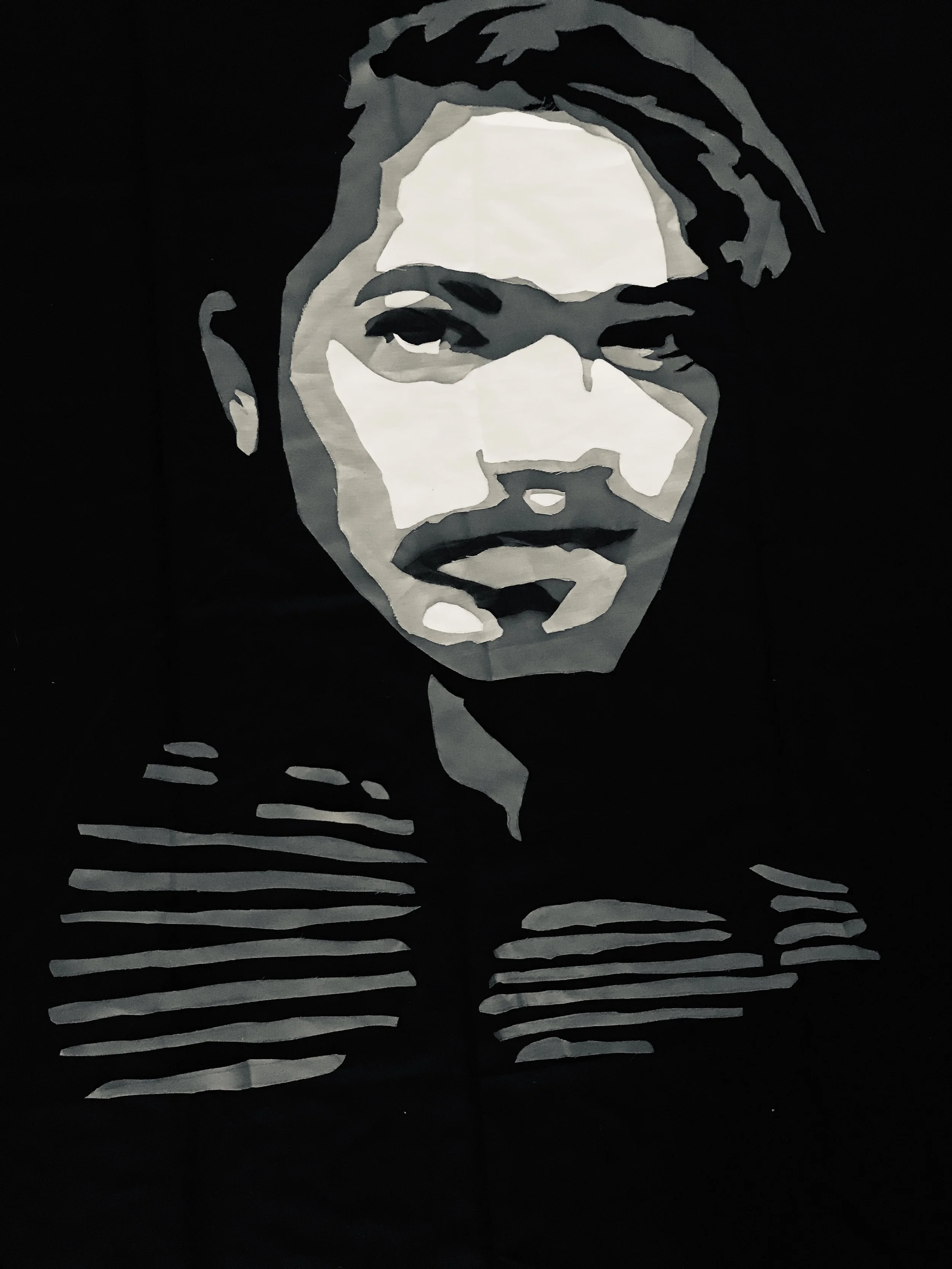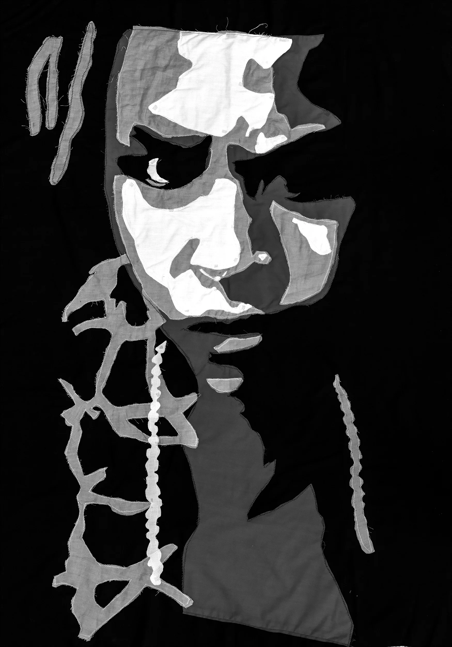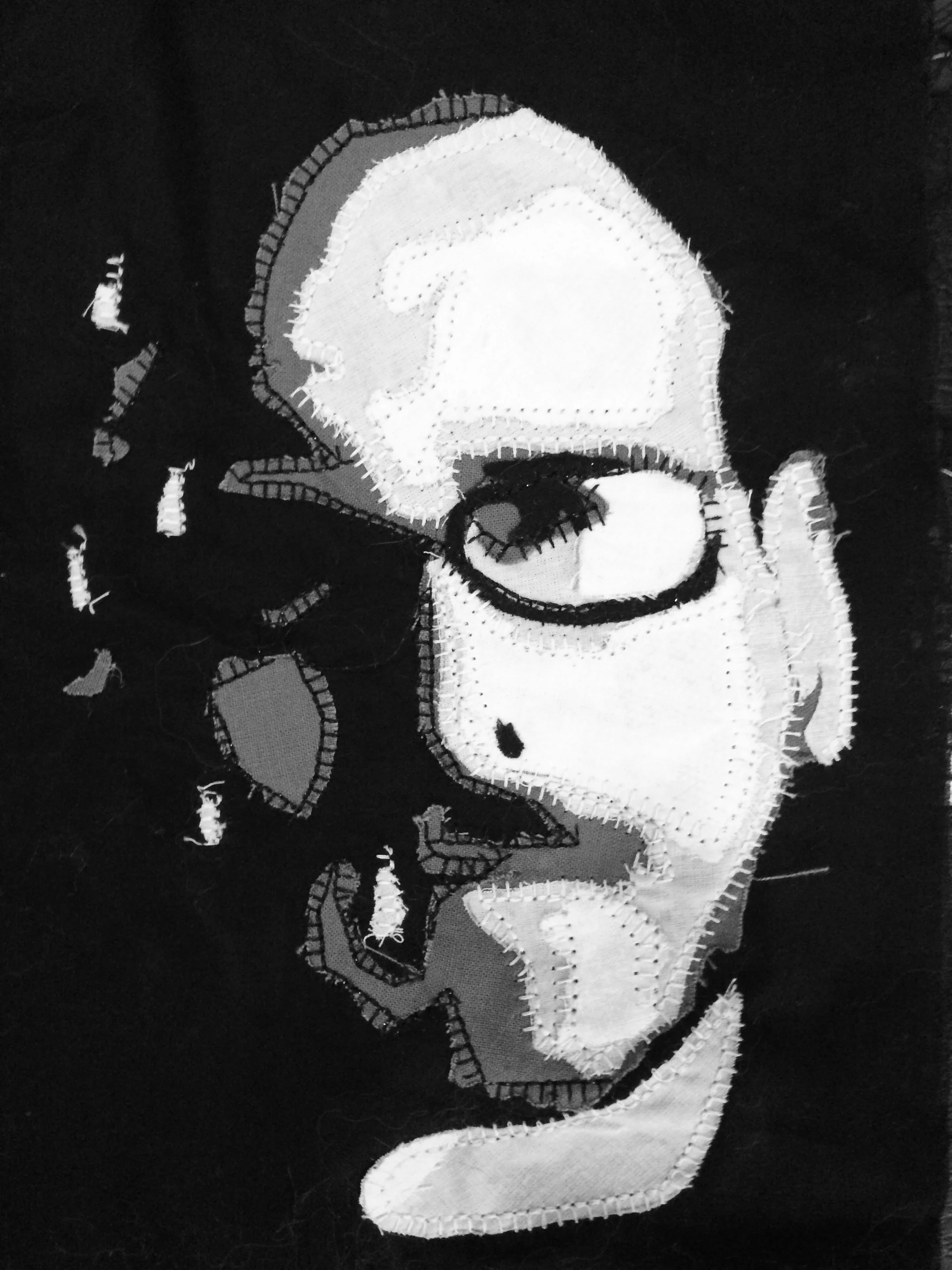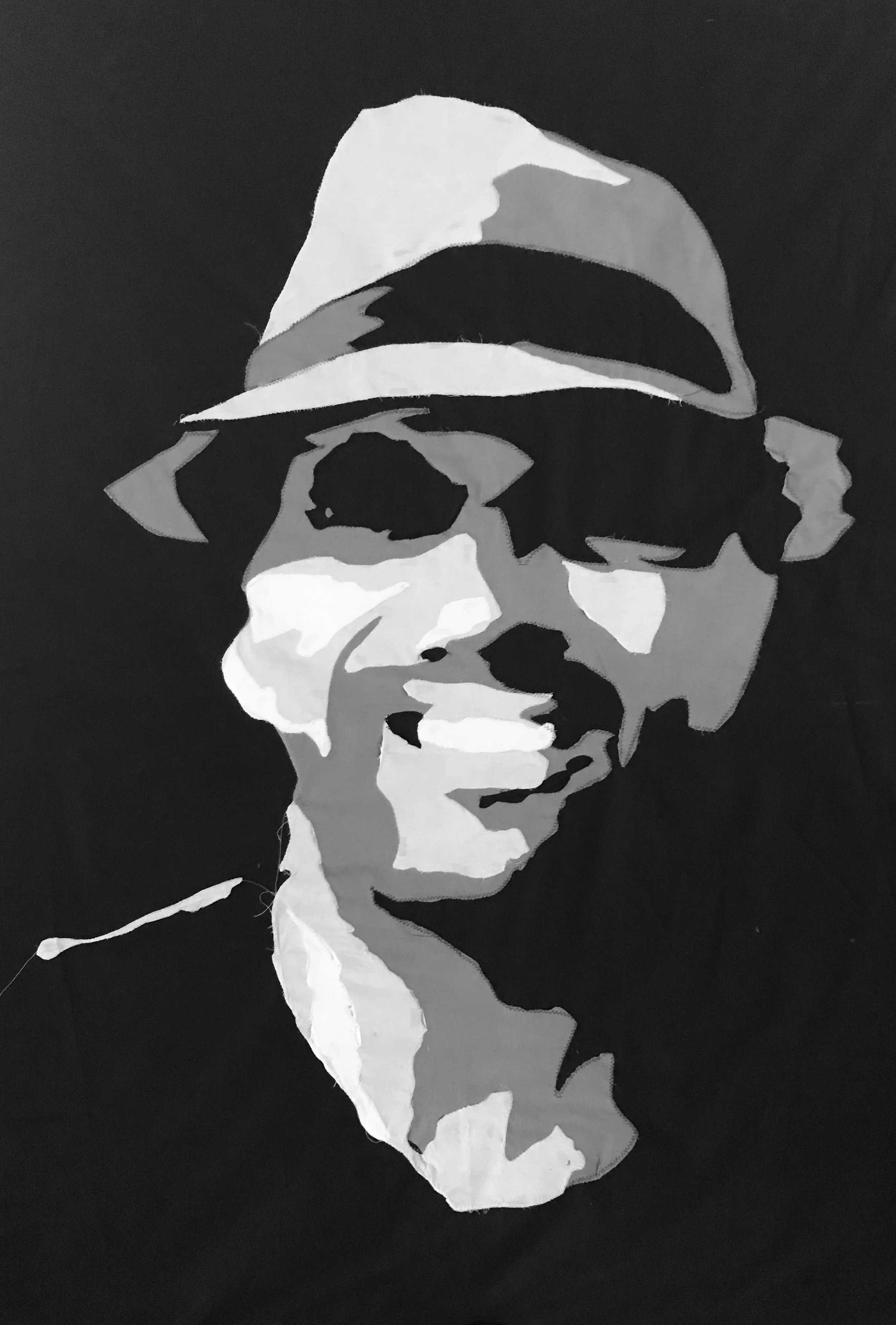 Erica Entrop's work involves a quilting process by simplifying, deconstructing, and reassembling portraits of familiar faces to recontextualize the idea of the 'selfie.' By using oddly shaped fabric scraps with varying opacities, she layers these pieces through stitching. Quilts having that historical or heirloom quality emphasize the contrast of the two notions.